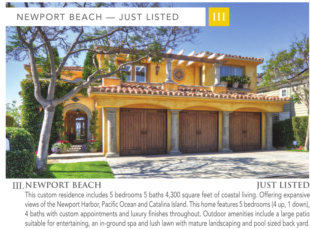 III. NEWPORT BEACH JUST LISTED This custom residence includes 5 bedrooms 5 baths 4,300 square feet of coastal living. Offering expansive views of the Newport Harbor, Pacific Ocean and Catalina Island. This home features 5 bedrooms (4 up, 1 down), 4 baths with custom appointments and luxury finishes throughout. Outdoor amenities include a large patio suitable for entertaining, an in-ground spa and lush lawn with mature landscaping and pool sized back yard.