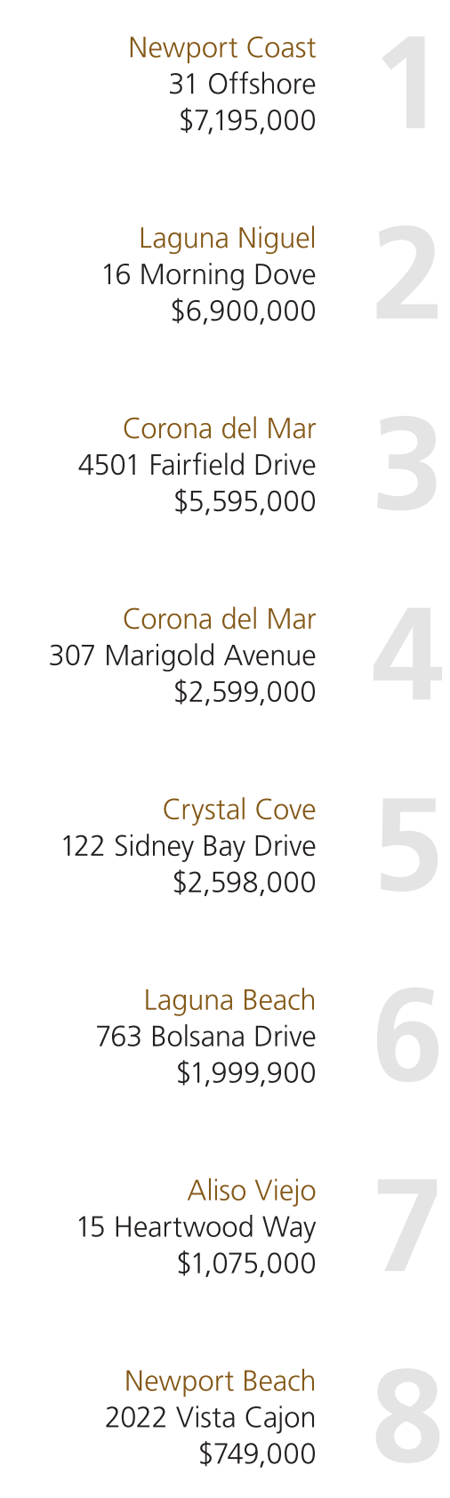 Newport Coast 31 Offshore $7,195,000 Laguna Niguel 16 Morning Dove $6,900,000 Corona del Mar 4501 Fairfield Drive $5,595,000 1 2 3 Corona del Mar 307 Marigold Avenue $2,599,000 Crystal Cove 122 Sidney Bay Drive $2,598,000 4 5 Laguna Beach 763 Bolsana Drive $1,999,900 Aliso Viejo 15 Heartwood Way $1,075,000 6 7 Newport Beach 2022 Vista Cajon $749,000 8