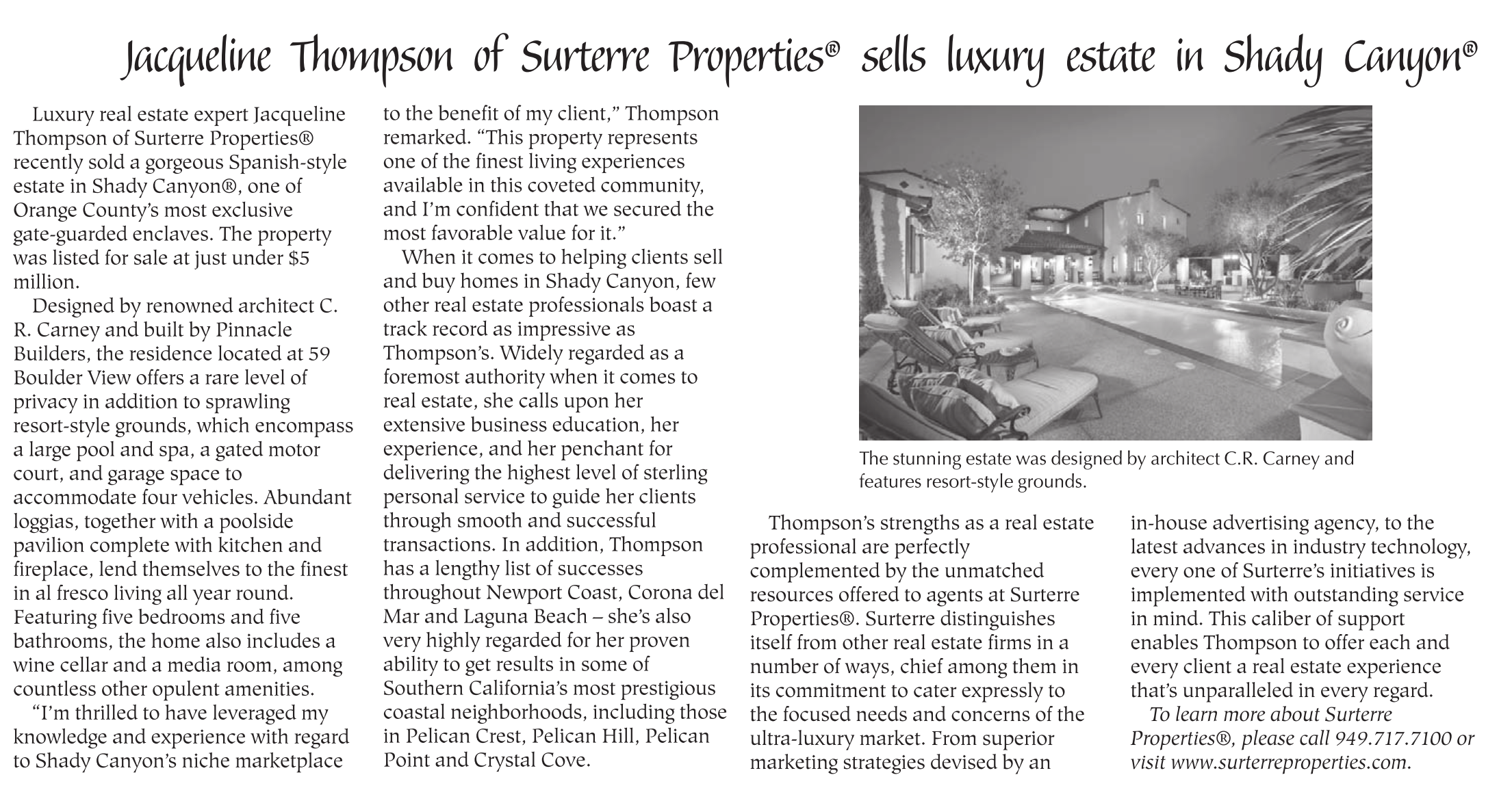 Jacqueline Thompson of Surterre Properties® sells luxury estate in Shady Canyon®