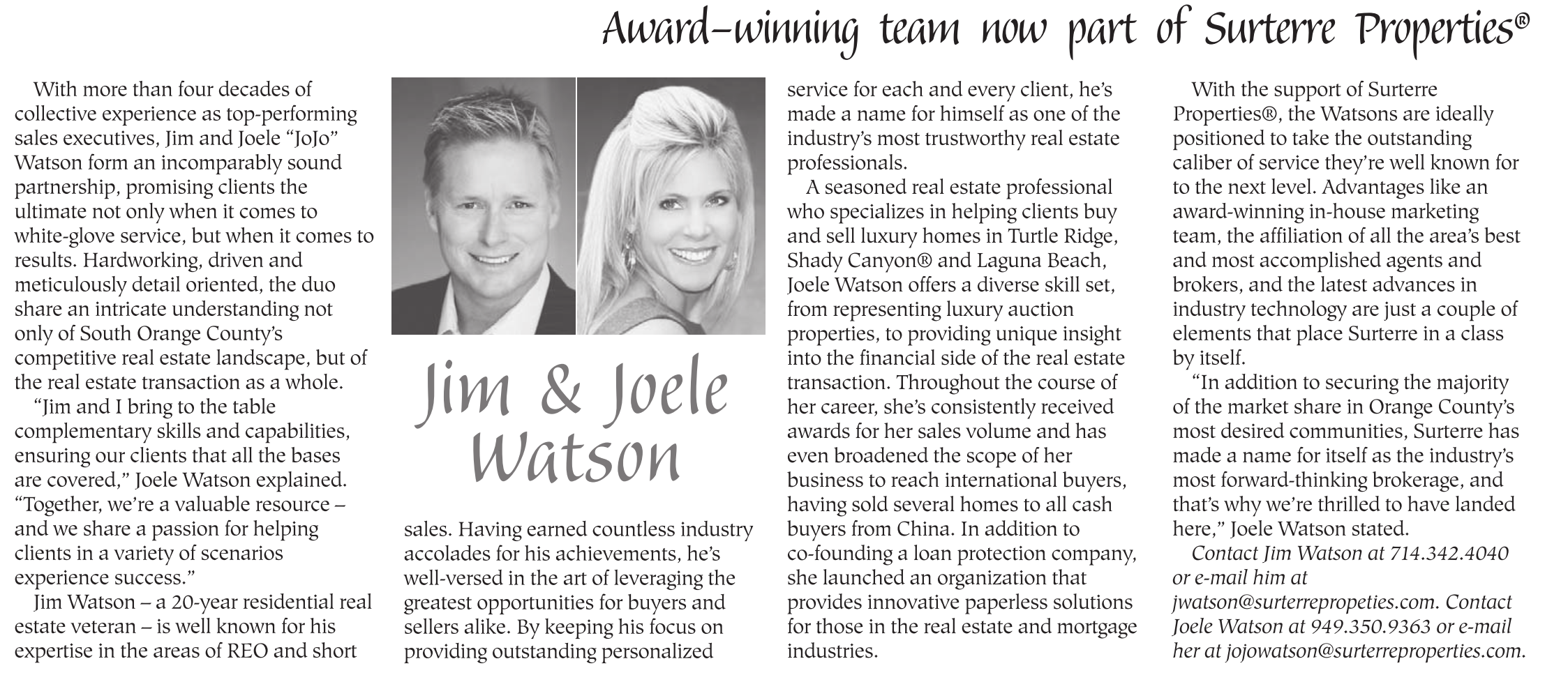 Contact Jim Watson at 714.342.4040 or e-mail him at jwatson@surterrepropeties.com. Contact Joele Watson at 949.350.9363 or e-mail her at jojowatson@surterreproperties.com.