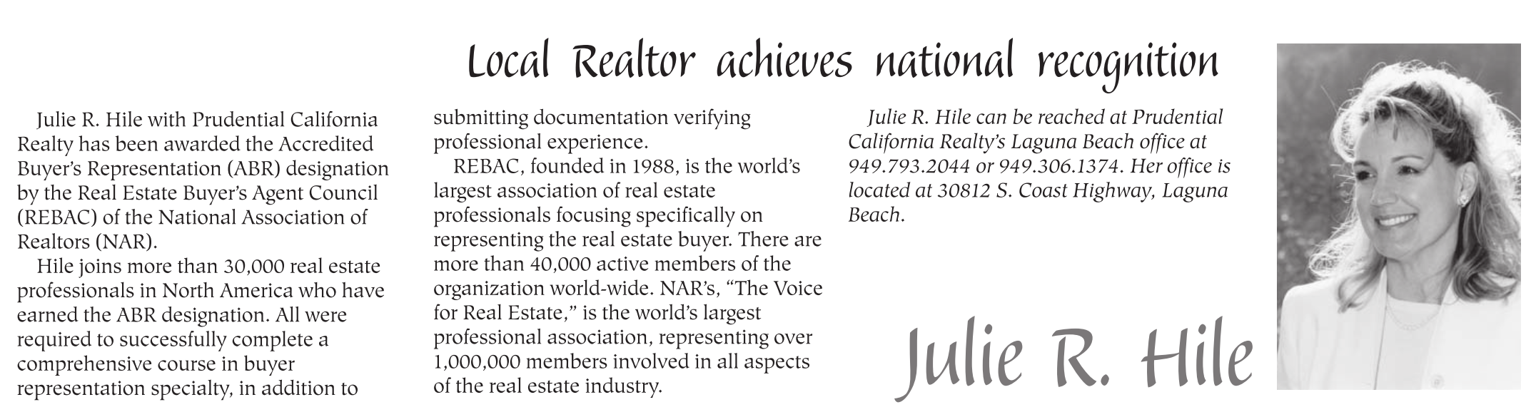 Julie R. Hile can be reached at Prudential California Realty’s Laguna Beach office at 949.793.2044 or 949.306.1374. Her office is located at 30812 S. Coast Highway, Laguna Beach.