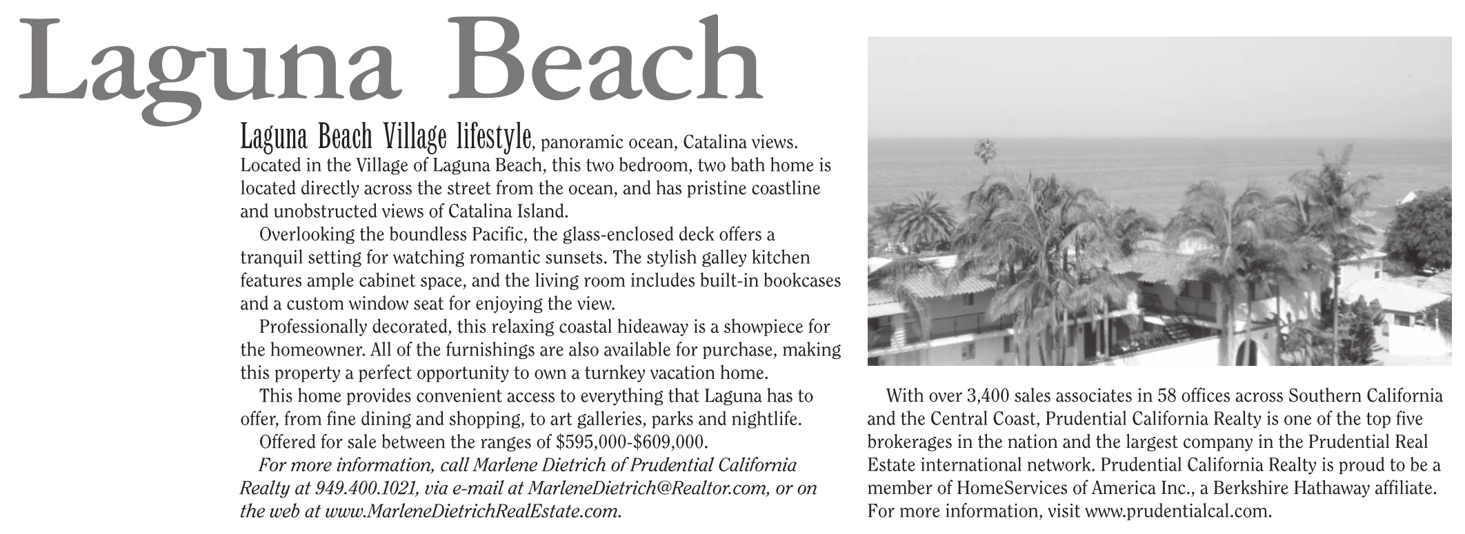 Offered for sale between the ranges of $595,000-$609,000. For more information, call Marlene Dietrich of Prudential California Realty at 949.400.1021, via e-mail at MarleneDietrich@Realtor.com, or on the web at www.MarleneDietrichRealEstate.com.