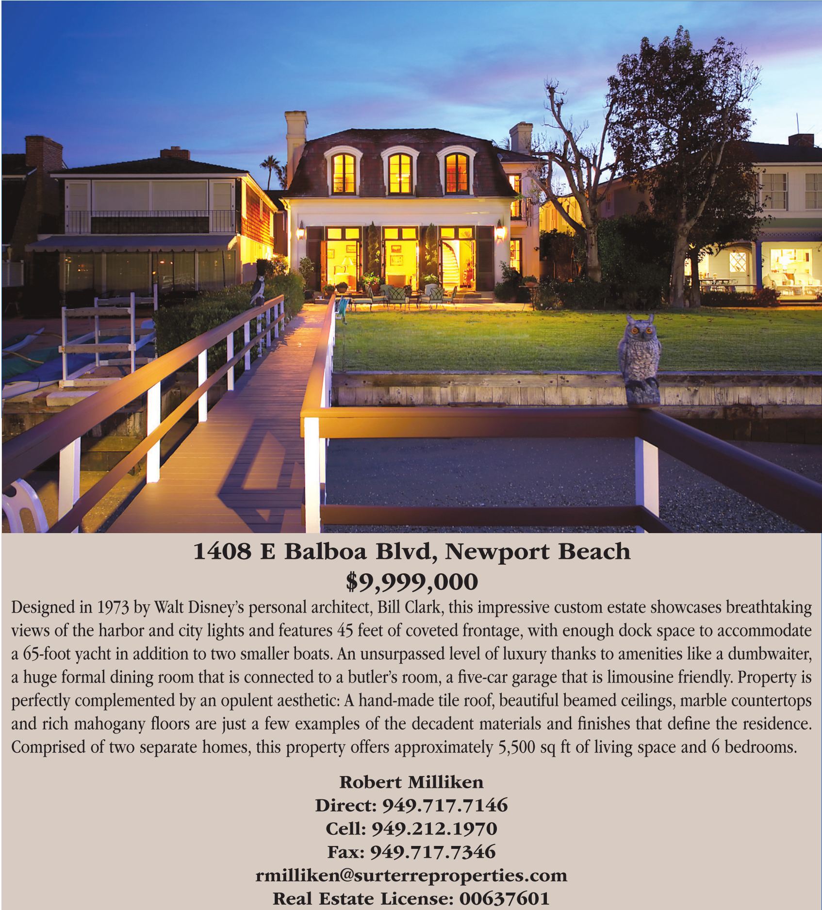1408 E Balboa Blvd, Newport Beach $9,999,000 Designed in 1973 by Walt Disney’s personal architect, Bill Clark, this impressive custom estate showcases breathtaking views of the harbor and city lights and features 45 feet of coveted frontage, with enough dock space to accommodate a 65-foot yacht in addition to two smaller boats. An unsurpassed level of luxury thanks to amenities like a dumbwaiter, a huge formal dining room that is connected to a butler’s room, a five-car garage that is limousine friendly. Property is perfectly complemented by an opulent aesthetic: A hand-made tile roof, beautiful beamed ceilings, marble countertops and rich mahogany floors are just a few examples of the decadent materials and finishes that define the residence. Comprised of two separate homes, this property offers approximately 5,500 sq ft of living space and 6 bedrooms. Robert Milliken Direct: 949.717.7146 Cell: 949.212.1970 Fax: 949.717.7346 rmilliken@surterreproperties.com Real Estate License: 00637601