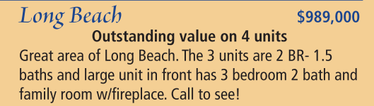 Great area of Long Beach. The 3 units are 2 BR- 1.5 baths and large unit in front has 3 bedroom 2 bath and family room w/fireplace. Call to see!