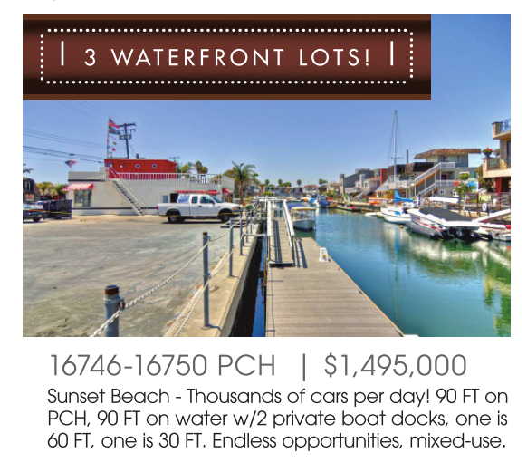 Sunset Beach - Thousands of cars per day! 90 FT on PCH, 90 FT on water w/2 private boat docks, one is 60 FT, one is 30 FT. Endless opportunities, mixed-use.