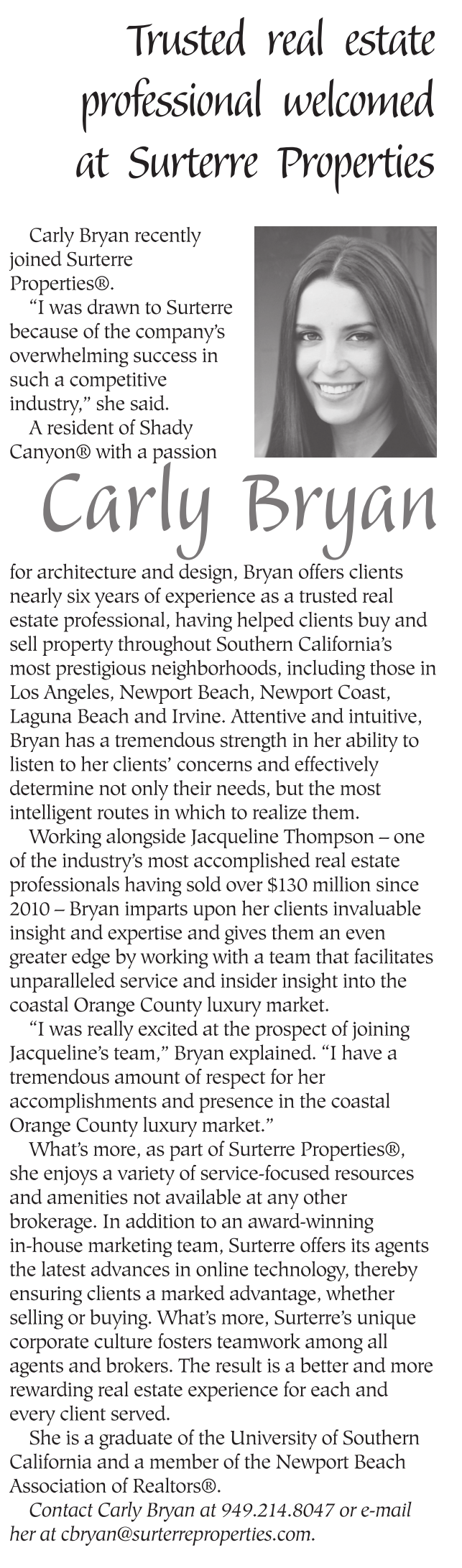 Contact Carly Bryan at 949.214.8047 or e-mail her at cbryan@surterreproperties.com.