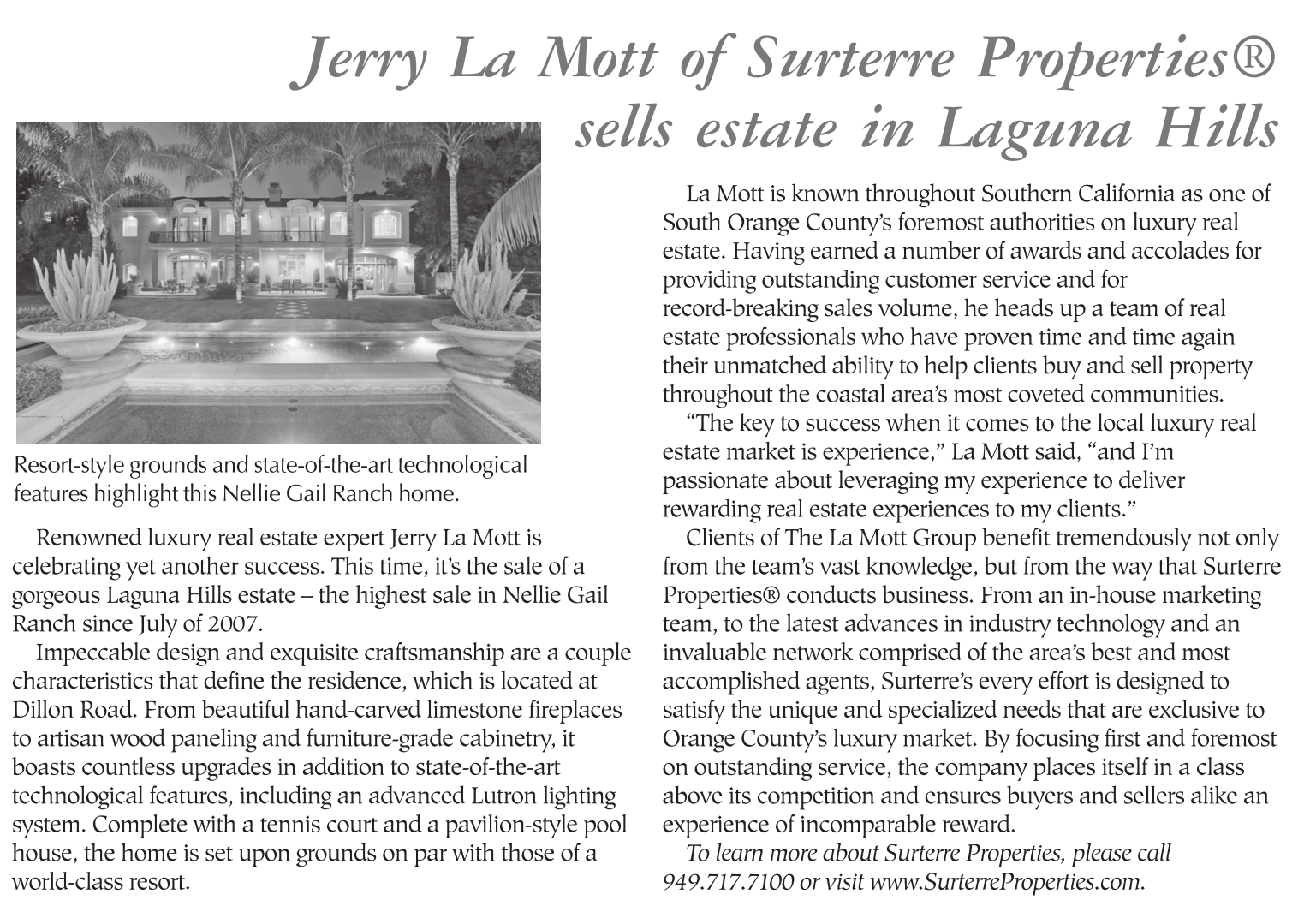 Jerry La Mott of Surterre Properties® sells estate in Laguna Hills