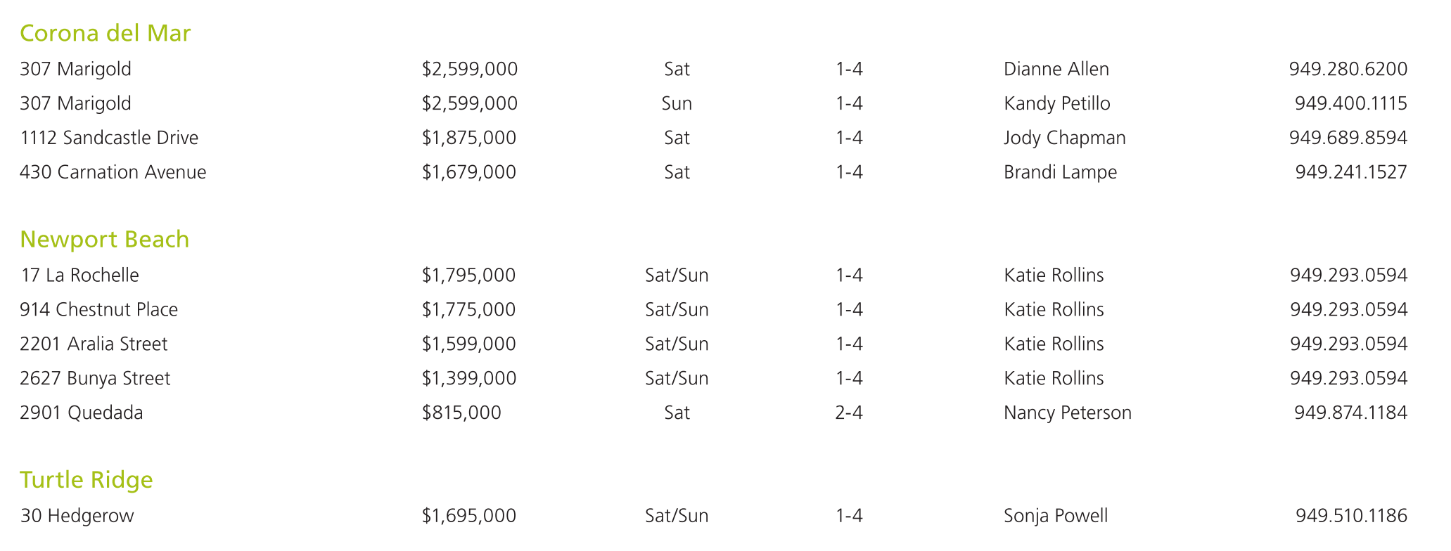 Corona del Mar 307 Marigold $2,599,000 Sat 1-4 Dianne Allen 949.280.6200 307 Marigold $2,599,000 Sun 1-4 Kandy Petillo 949.400.1115 1112 Sandcastle Drive $1,875,000 Sat 1-4 Jody Chapman 949.689.8594 430 Carnation Avenue $1,679,000 Sat 1-4 Brandi Lampe 949.241.1527 Newport Beach 17 La Rochelle $1,795,000 Sat/Sun 1-4 Katie Rollins 949.293.0594 914 Chestnut Place $1,775,000 Sat/Sun 1-4 Katie Rollins 949.293.0594 2201 Aralia Street $1,599,000 Sat/Sun 1-4 Katie Rollins 949.293.0594 2627 Bunya Street $1,399,000 Sat/Sun 1-4 Katie Rollins 949.293.0594 2901 Quedada $815,000 Sat 2-4 Nancy Peterson 949.874.1184 Turtle Ridge 30 Hedgerow $1,695,000 Sat/Sun 1-4 Sonja Powell 949.510.1186
