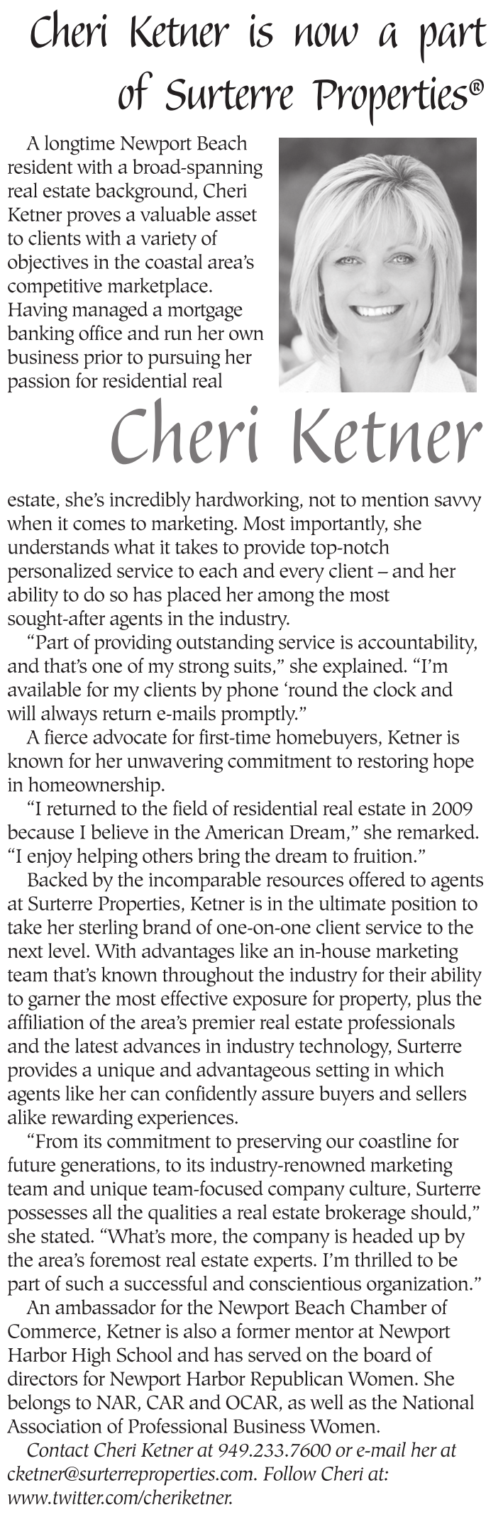 Contact Cheri Ketner at 949.233.7600 or e-mail her at cketner@surterreproperties.com. Follow Cheri at: www.twitter.com/cheriketner.