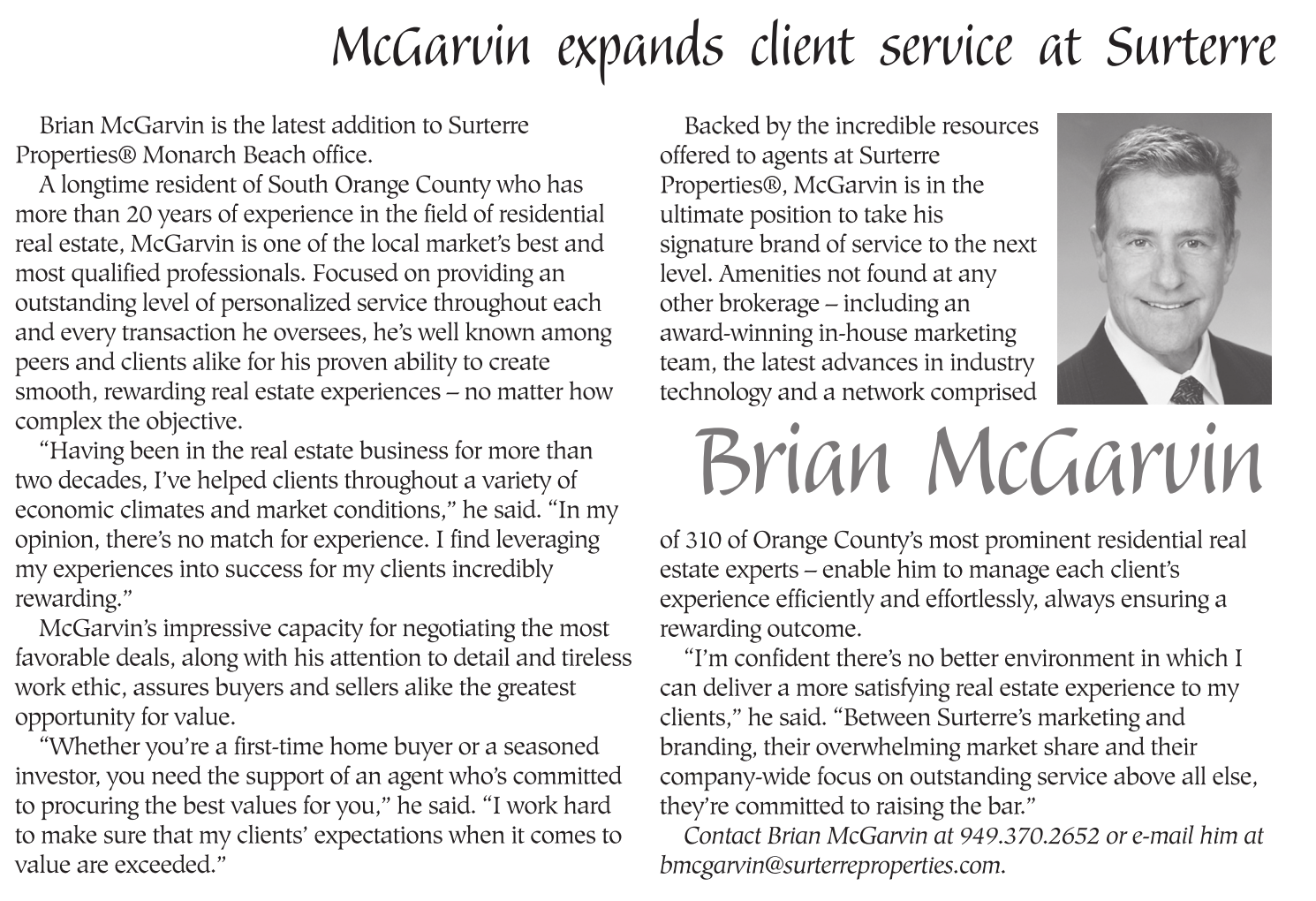 Brian McGarvin is the latest addition to Surterre Properties® Monarch Beach office.