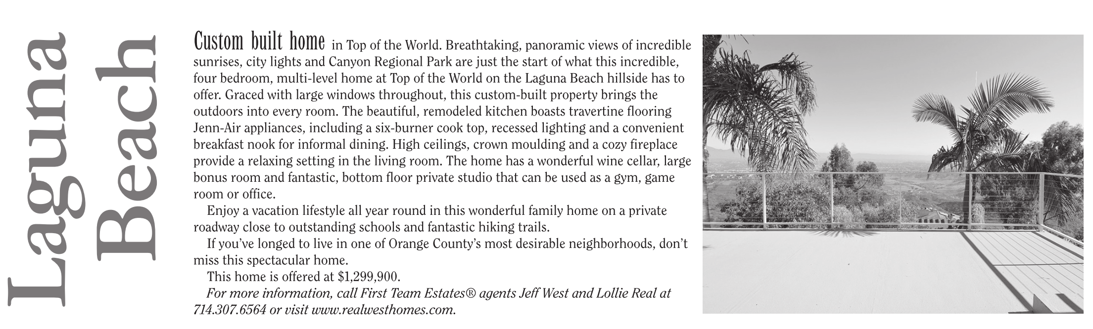 Custom built home in Top of the World. Breathtaking, panoramic views of incredible sunrises, city lights and Canyon Regional Park are just the start of what this incredible, four bedroom, multi-level home at Top of the World on the Laguna Beach hillside has to offer. Graced with large windows throughout, this custom-built property brings the outdoors into every room. The beautiful, remodeled kitchen boasts travertine flooring Jenn-Air appliances, including a six-burner cook top, recessed lighting and a convenient breakfast nook for informal dining. High ceilings, crown moulding and a cozy fireplace provide a relaxing setting in the living room. The home has a wonderful wine cellar, large bonus room and fantastic, bottom floor private studio that can be used as a gym, game room or office. Enjoy a vacation lifestyle all year round in this wonderful family home on a private roadway close to outstanding schools and fantastic hiking trails. If you’ve longed to live in one of Orange County’s most desirable neighborhoods, don’t miss this spectacular home. This home is offered at $1,299,900. For more information, call First Team Estates® agents Jeff West and Lollie Real at 714.307.6564 or visit www.realwesthomes.com.