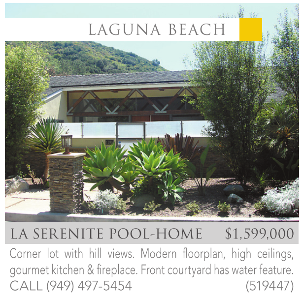LA SERENITE POOL-HOME $1,599,000 Corner lot with hill views. Modern floorplan, high ceilings, gourmet kitchen & fireplace. Front courtyard has water feature. CALL (949) 497-5454 (519447)