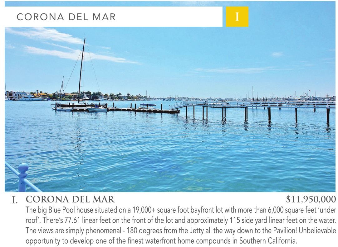 CORONA DEL MAR I I. CORONA DEL MAR $11,950,000 The big Blue Pool house situated on a 19,000+ square foot bayfront lot with more than 6,000 square feet ‘under roof’. There’s 77.61 linear feet on the front of the lot and approximately 115 side yard linear feet on the water. The views are simply phenomenal - 180 degrees from the Jetty all the way down to the Pavilion! Unbelievable opportunity to develop one of the finest waterfront home compounds in Southern California.