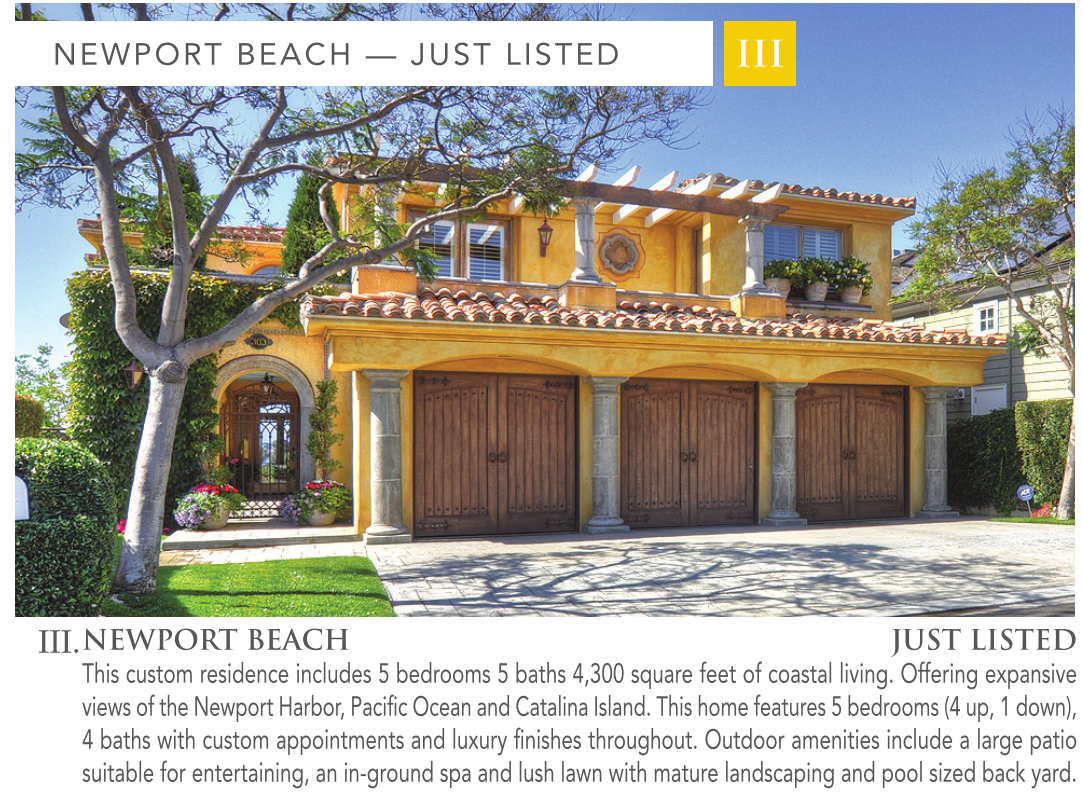 III. NEWPORT BEACH JUST LISTED This custom residence includes 5 bedrooms 5 baths 4,300 square feet of coastal living. Offering expansive views of the Newport Harbor, Pacific Ocean and Catalina Island. This home features 5 bedrooms (4 up, 1 down), 4 baths with custom appointments and luxury finishes throughout. Outdoor amenities include a large patio suitable for entertaining, an in-ground spa and lush lawn with mature landscaping and pool sized back yard.