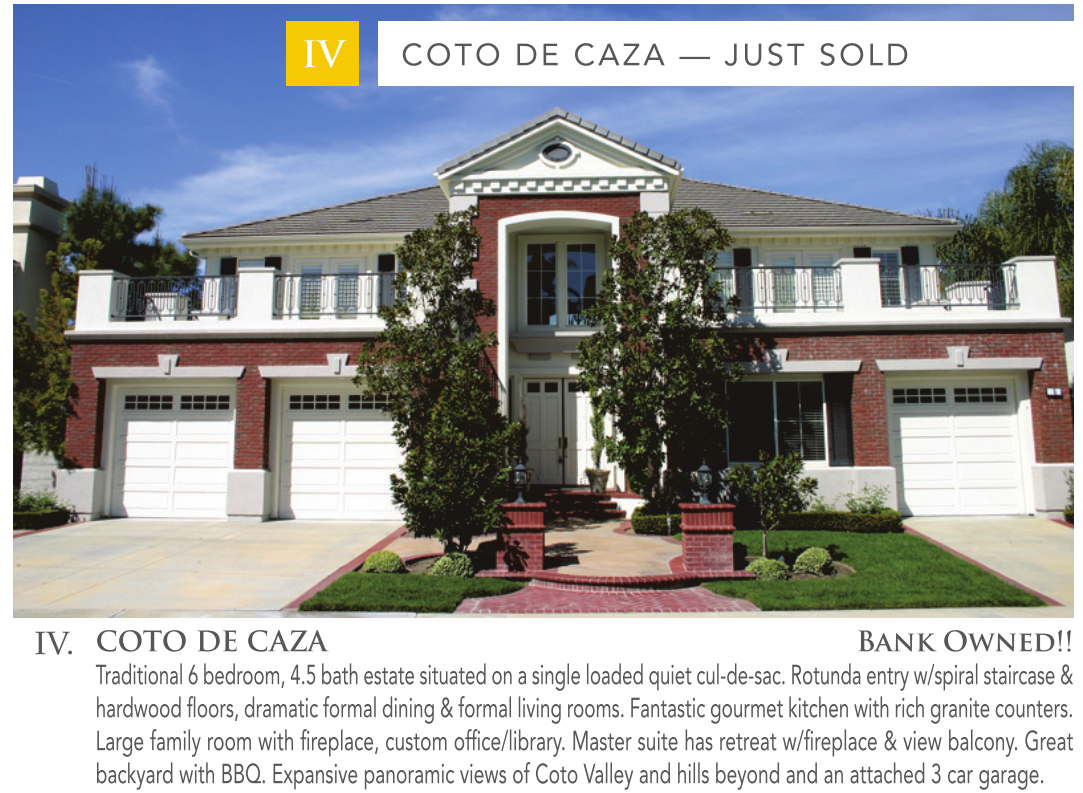 IV COTO DE CAZA — JUST SOLD IV. COTO DE CAZA Bank Owned!! Traditional 6 bedroom, 4.5 bath estate situated on a single loaded quiet cul-de-sac. Rotunda entry w/spiral staircase & hardwood floors, dramatic formal dining & formal living rooms. Fantastic gourmet kitchen with rich granite counters. Large family room with fireplace, custom office/library. Master suite has retreat w/fireplace & view balcony. Great backyard with BBQ. Expansive panoramic views of Coto Valley and hills beyond and an attached 3 car garage.