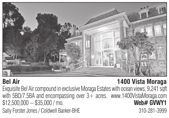 Bel Air 1400 Vista Moraga Exquisite Bel Air compound in exclusive Moraga Estates with ocean views, 9,241 sqft with 5BD/7.5BA and encompassing over 3+ acres. www.1400VistaMoraga.com $12,500,000 -- $35,000 / mo. Web# GVWY1 Sally Forster Jones / Coldwell Banker-BHE 310-281-3999