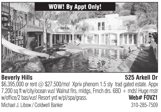 WOW! By Appt Only! Beverly Hills 525 Arkell Dr $6,395,000 or rent @ $27,500/mo! Xpriv phenom 1.5 sty trad gated estate. Appx 7,200 sq ft w/city/ocean vus! Walnut flrs, mldgs, Frnch drs. 6BD + mds! Huge mstr w/office/2 bas/vus! Resort yrd w/pl/spa/grass. Web# FOVZ1 Michael J. Libow / Coldwell Banker 310-285-7509