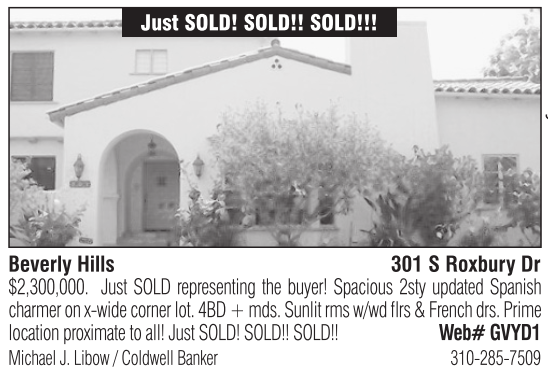 Just SOLD! SOLD!! SOLD!!! Beverly Hills 301 S Roxbury Dr $2,300,000. Just SOLD representing the buyer! Spacious 2sty updated Spanish charmer on x-wide corner lot. 4BD + mds. Sunlit rms w/wd flrs & French drs. Prime location proximate to all! Just SOLD! SOLD!! SOLD!! Web# GVYD1 Michael J. Libow / Coldwell Banker 310-285-7509 See also