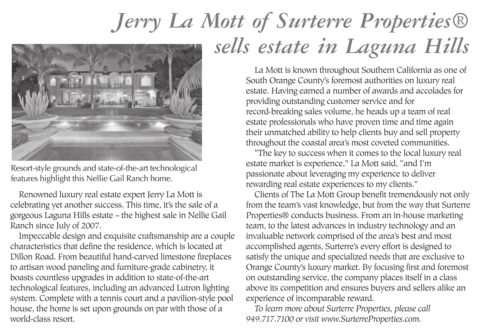 Jerry La Mott of Surterre Properties® sells estate in Laguna Hills Resort-style grounds and state-of-the-art technological features highlight this Nellie Gail Ranch home. Renowned luxury real estate expert Jerry La Mott is celebrating yet another success. This time, it’s the sale of a gorgeous Laguna Hills estate – the highest sale in Nellie Gail Ranch since July of 2007. Impeccable design and exquisite craftsmanship are a couple characteristics that define the residence, which is located at Dillon Road. From beautiful hand-carved limestone fireplaces to artisan wood paneling and furniture-grade cabinetry, it boasts countless upgrades in addition to state-of-the-art technological features, including an advanced Lutron lighting system. Complete with a tennis court and a pavilion-style pool house, the home is set upon grounds on par with those of a world-class resort. La Mott is known throughout Southern California as one of South Orange County’s foremost authorities on luxury real estate. Having earned a number of awards and accolades for providing outstanding customer service and for record-breaking sales volume, he heads up a team of real estate professionals who have proven time and time again their unmatched ability to help clients buy and sell property throughout the coastal area’s most coveted communities. “The key to success when it comes to the local luxury real estate market is experience,” La Mott said, “and I’m passionate about leveraging my experience to deliver rewarding real estate experiences to my clients.” Clients of The La Mott Group benefit tremendously not only from the team’s vast knowledge, but from the way that Surterre Properties® conducts business. From an in-house marketing team, to the latest advances in industry technology and an invaluable network comprised of the area’s best and most accomplished agents, Surterre’s every effort is designed to satisfy the unique and specialized needs that are exclusive to Orange County’s luxury market. By focusing first and foremost on outstanding service, the company places itself in a class above its competition and ensures buyers and sellers alike an experience of incomparable reward. To learn more about Surterre Properties, please call 949.717.7100 or visit www.SurterreProperties.com.