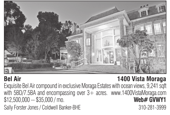 Bel Air 1400 Vista Moraga Exquisite Bel Air compound in exclusive Moraga Estates with ocean views, 9,241 sqft with 5BD/7.5BA and encompassing over 3+ acres. www.1400VistaMoraga.com $12,500,000 -- $35,000 / mo. Web# GVWY1 Sally Forster Jones / Coldwell Banker-BHE 310-281-3999
