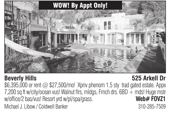 WOW! By Appt Only! Beverly Hills 525 Arkell Dr $6,395,000 or rent @ $27,500/mo! Xpriv phenom 1.5 sty trad gated estate. Appx 7,200 sq ft w/city/ocean vus! Walnut flrs, mldgs, Frnch drs. 6BD + mds! Huge mstr w/office/2 bas/vus! Resort yrd w/pl/spa/grass. Web# FOVZ1 Michael J. Libow / Coldwell Banker 310-285-7509