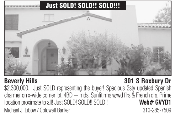 Just SOLD! SOLD!! SOLD!!! Beverly Hills 301 S Roxbury Dr $2,300,000. Just SOLD representing the buyer! Spacious 2sty updated Spanish charmer on x-wide corner lot. 4BD + mds. Sunlit rms w/wd flrs & French drs. Prime location proximate to all! Just SOLD! SOLD!! SOLD!! Web# GVYD1 Michael J. Libow / Coldwell Banker 310-285-7509 See also
