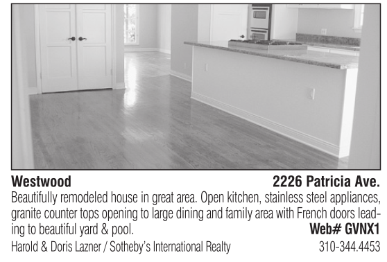 Westwood 2226 Patricia Ave. Beautifully remodeled house in great area. Open kitchen, stainless steel appliances, granite counter tops opening to large dining and family area with French doors leading to beautiful yard & pool. Web# GVNX1 Harold & Doris Lazner / Sotheby’s International Realty 310-344.4453