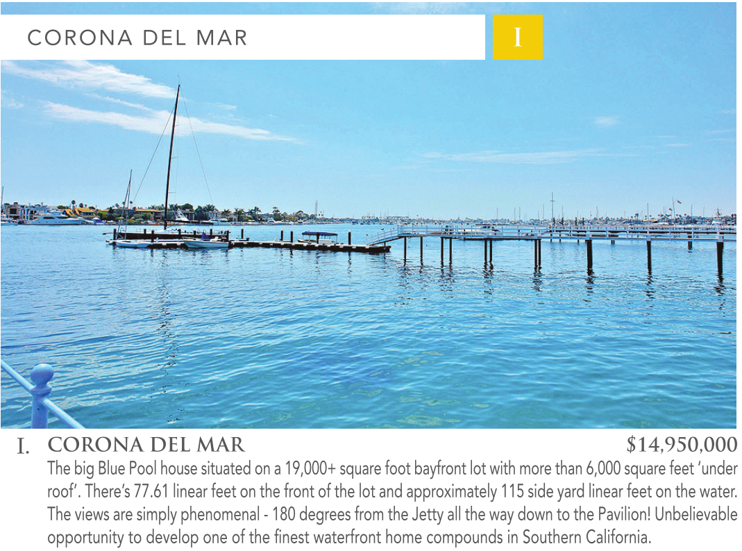 CORONA DEL MAR I I. CORONA DEL MAR $14,950,000 The big Blue Pool house situated on a 19,000+ square foot bayfront lot with more than 6,000 square feet ‘under roof’. There’s 77.61 linear feet on the front of the lot and approximately 115 side yard linear feet on the water. The views are simply phenomenal - 180 degrees from the Jetty all the way down to the Pavilion! Unbelievable opportunity to develop one of the finest waterfront home compounds in Southern California.