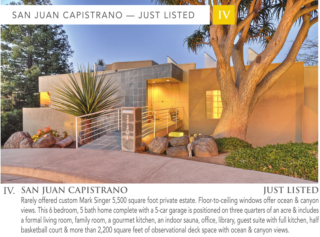 SAN JUAN CAPISTRANO — JUST LISTED IV IV. SAN JUAN CAPISTRANO JUST LISTED Rarely offered custom Mark Singer 5,500 square foot private estate. Floor-to-ceiling windows offer ocean & canyon views. This 6 bedroom, 5 bath home complete with a 5-car garage is positioned on three quarters of an acre & includes a formal living room, family room, a gourmet kitchen, an indoor sauna, office, library, guest suite with full kitchen, half basketball court & more than 2,200 square feet of observational deck space with ocean & canyon views.
