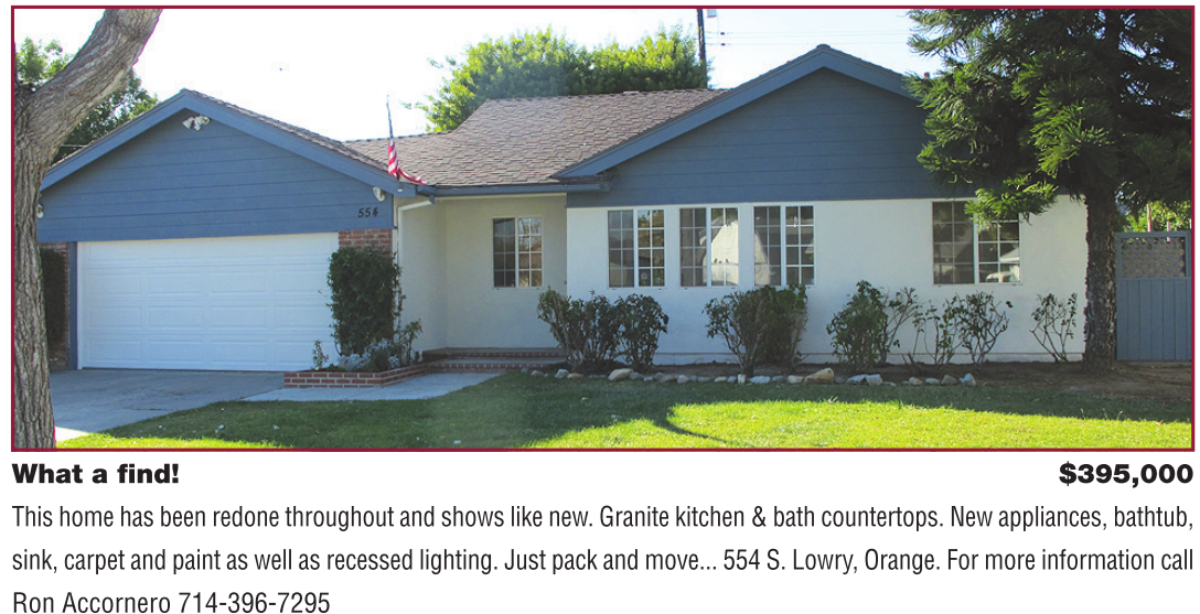 What a find! $395,000 This home has been redone throughout and shows like new. Granite kitchen & bath countertops. New appliances, bathtub, sink, carpet and paint as well as recessed lighting. Just pack and move... 554 S. Lowry, Orange. For more information call Ron Accornero 714-396-7295