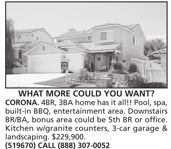 WHAT MORE COULD YOU WANT? CORONA. 4BR, 3BA home has it all!! Pool, spa, built-in BBQ, entertainment area. Downstairs BR/BA, bonus area could be 5th BR or office. Kitchen w/granite counters, 3-car garage & landscaping. $229,900. (519670) CALL (888) 307-0052