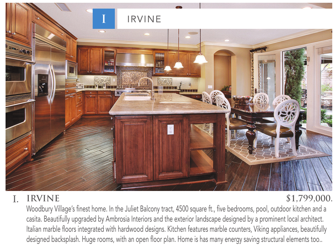 I IRVINE I. IRVINE $1,799,000. Woodbury Village’s finest home. In the Juliet Balcony tract, 4500 square ft., five bedrooms, pool, outdoor kitchen and a casita. Beautifully upgraded by Ambrosia Interiors and the exterior landscape designed by a prominent local architect. Italian marble floors integrated with hardwood designs. Kitchen features marble counters, Viking appliances, beautifully designed backsplash. Huge rooms, with an open floor plan. Home is has many energy saving structural elements too..