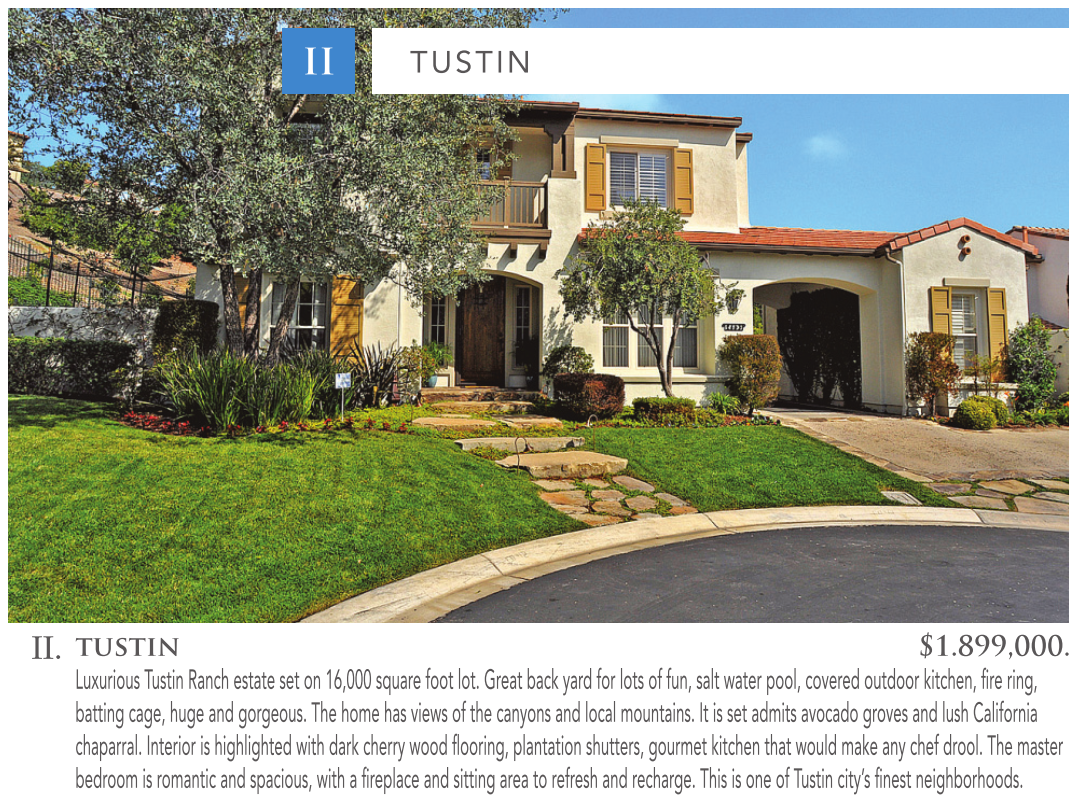 tustin $1.899,000. Luxurious Tustin Ranch estate set on 16,000 square foot lot. Great back yard for lots of fun, salt water pool, covered outdoor kitchen, fire ring, batting cage, huge and gorgeous. The home has views of the canyons and local mountains. It is set admits avocado groves and lush California chaparral. Interior is highlighted with dark cherry wood flooring, plantation shutters, gourmet kitchen that would make any chef drool. The master bedroom is romantic and spacious, with a fireplace and sitting area to refresh and recharge. This is one of Tustin city’s finest neighborhoods.