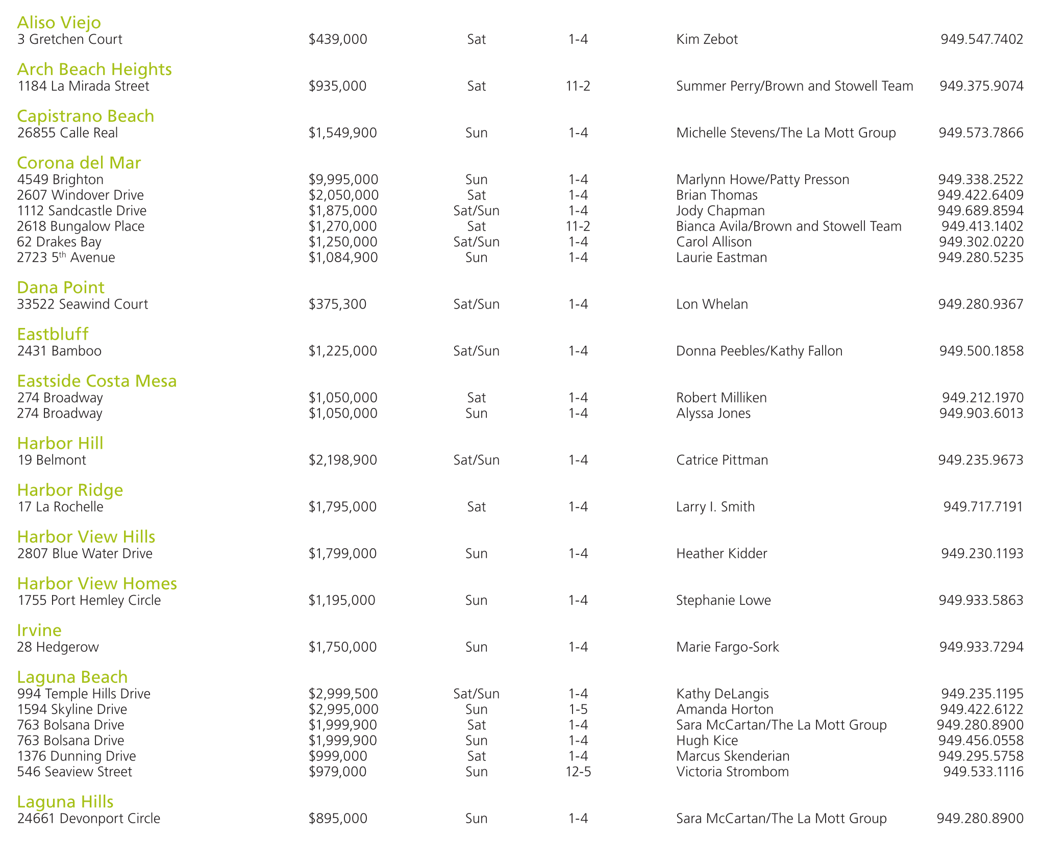 Aliso Viejo 3 Gretchen Court $439,000 Sat 1-4 Kim Zebot 949.547.7402 Arch Beach Heights 1184 La Mirada Street $935,000 Sat 11-2 Summer Perry/Brown and Stowell Team 949.375.9074 Capistrano Beach 26855 Calle Real $1,549,900 Sun 1-4 Michelle Stevens/The La Mott Group 949.573.7866 Corona del Mar 4549 Brighton $9,995,000 Sun 1-4 Marlynn Howe/Patty Presson 949.338.2522 2607 Windover Drive $2,050,000 Sat 1-4 Brian Thomas 949.422.6409 1112 Sandcastle Drive $1,875,000 Sat/Sun 1-4 Jody Chapman 949.689.8594 2618 Bungalow Place $1,270,000 Sat 11-2 Bianca Avila/Brown and Stowell Team 949.413.1402 62 Drakes Bay $1,250,000 Sat/Sun 1-4 Carol Allison 949.302.0220 2723 5 th Avenue $1,084,900 Sun 1-4 Laurie Eastman 949.280.5235 Dana Point 33522 Seawind Court $375,300 Sat/Sun 1-4 Lon Whelan 949.280.9367 Eastbluff 2431 Bamboo $1,225,000 Sat/Sun 1-4 Donna Peebles/Kathy Fallon 949.500.1858 Eastside Costa Mesa 274 Broadway $1,050,000 Sat 1-4 Robert Milliken 949.212.1970 274 Broadway $1,050,000 Sun 1-4 Alyssa Jones 949.903.6013 Harbor Hill 19 Belmont $2,198,900 Sat/Sun 1-4 Catrice Pittman 949.235.9673 Harbor Ridge 17 La Rochelle $1,795,000 Sat 1-4 Larry I. Smith 949.717.7191 Harbor View Hills 2807 Blue Water Drive $1,799,000 Sun 1-4 Heather Kidder 949.230.1193 Harbor View Homes 1755 Port Hemley Circle $1,195,000 Sun 1-4 Stephanie Lowe 949.933.5863 Irvine 28 Hedgerow $1,750,000 Sun 1-4 Marie Fargo-Sork 949.933.7294 Laguna Beach 994 Temple Hills Drive $2,999,500 Sat/Sun 1-4 Kathy DeLangis 949.235.1195 1594 Skyline Drive $2,995,000 Sun 1-5 Amanda Horton 949.422.6122 763 Bolsana Drive $1,999,900 Sat 1-4 Sara McCartan/The La Mott Group 949.280.8900 763 Bolsana Drive $1,999,900 Sun 1-4 Hugh Kice 949.456.0558 1376 Dunning Drive $999,000 Sat 1-4 Marcus Skenderian 949.295.5758 546 Seaview Street $979,000 Sun 12-5 Victoria Strombom 949.533.1116 Laguna Hills 24661 Devonport Circle $895,000 Sun 1-4 Sara McCartan/The La Mott Group 949.280.8900