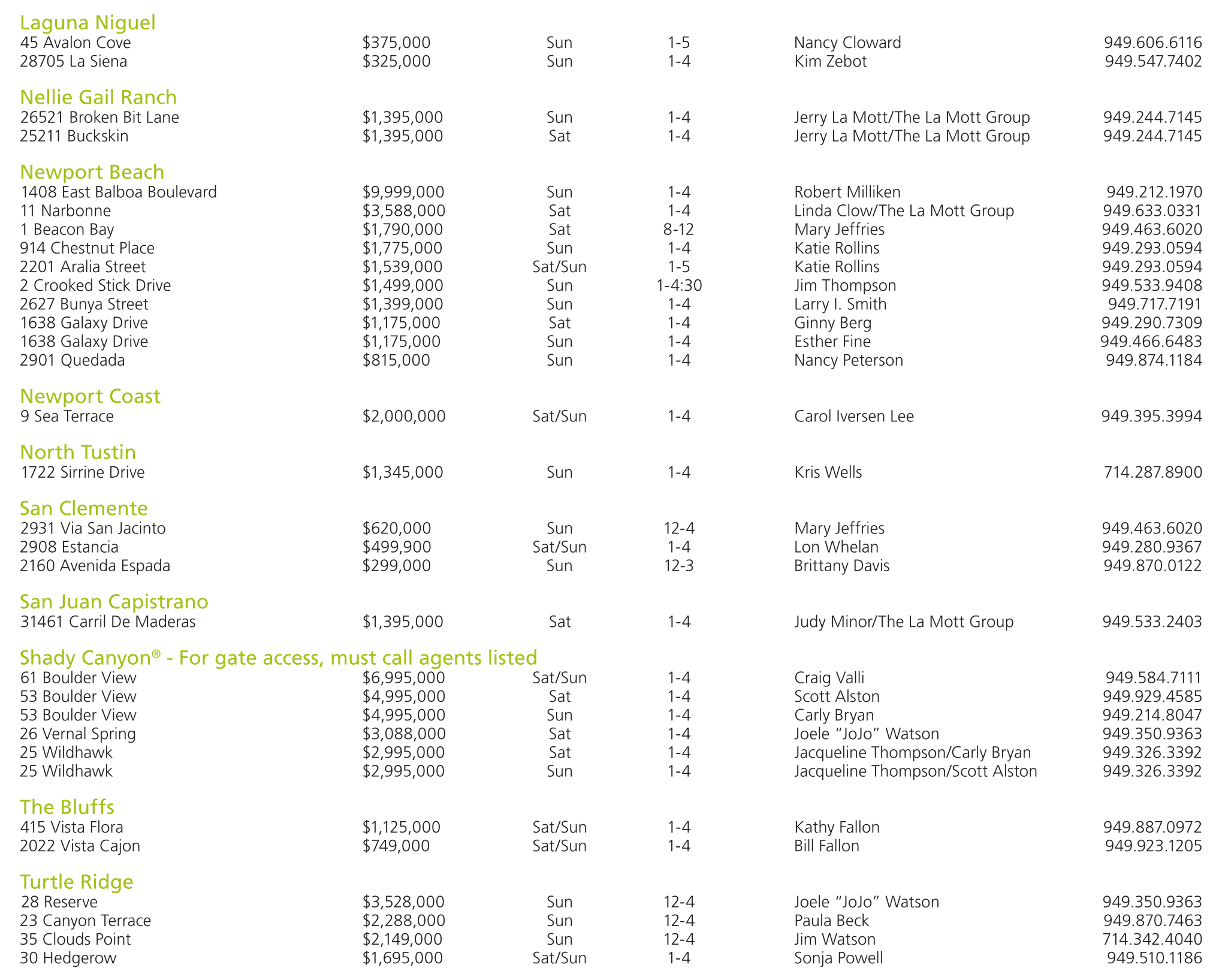 Laguna Niguel 45 Avalon Cove $375,000 Sun 1-5 Nancy Cloward 949.606.6116 28705 La Siena $325,000 Sun 1-4 Kim Zebot 949.547.7402 Nellie Gail Ranch 26521 Broken Bit Lane $1,395,000 Sun 1-4 Jerry La Mott/The La Mott Group 949.244.7145 25211 Buckskin $1,395,000 Sat 1-4 Jerry La Mott/The La Mott Group 949.244.7145 Newport Beach 1408 East Balboa Boulevard $9,999,000 Sun 1-4 Robert Milliken 949.212.1970 11 Narbonne $3,588,000 Sat 1-4 Linda Clow/The La Mott Group 949.633.0331 1 Beacon Bay $1,790,000 Sat 8-12 Mary Jeffries 949.463.6020 914 Chestnut Place $1,775,000 Sun 1-4 Katie Rollins 949.293.0594 2201 Aralia Street $1,539,000 Sat/Sun 1-5 Katie Rollins 949.293.0594 2 Crooked Stick Drive $1,499,000 Sun 1-4:30 Jim Thompson 949.533.9408 2627 Bunya Street $1,399,000 Sun 1-4 Larry I. Smith 949.717.7191 1638 Galaxy Drive $1,175,000 Sat 1-4 Ginny Berg 949.290.7309 1638 Galaxy Drive $1,175,000 Sun 1-4 Esther Fine 949.466.6483 2901 Quedada $815,000 Sun 1-4 Nancy Peterson 949.874.1184 Newport Coast 9 Sea Terrace $2,000,000 Sat/Sun 1-4 Carol Iversen Lee 949.395.3994 North Tustin 1722 Sirrine Drive $1,345,000 Sun 1-4 Kris Wells 714.287.8900 San Clemente 2931 Via San Jacinto $620,000 Sun 12-4 Mary Jeffries 949.463.6020 2908 Estancia $499,900 Sat/Sun 1-4 Lon Whelan 949.280.9367 2160 Avenida Espada $299,000 Sun 12-3 Brittany Davis 949.870.0122 San Juan Capistrano 31461 Carril De Maderas $1,395,000 Sat 1-4 Judy Minor/The La Mott Group 949.533.2403 Shady Canyon ® - For gate access, must call agents listed 61 Boulder View $6,995,000 Sat/Sun 1-4 Craig Valli 949.584.7111 53 Boulder View $4,995,000 Sat 1-4 Scott Alston 949.929.4585 53 Boulder View $4,995,000 Sun 1-4 Carly Bryan 949.214.8047 26 Vernal Spring $3,088,000 Sat 1-4 Joele “JoJo” Watson 949.350.9363 25 Wildhawk $2,995,000 Sat 1-4 Jacqueline Thompson/Carly Bryan 949.326.3392 25 Wildhawk $2,995,000 Sun 1-4 Jacqueline Thompson/Scott Alston 949.326.3392 The Bluffs 415 Vista Flora $1,125,000 Sat/Sun 1-4 Kathy Fallon 949.887.0972 2022 Vista Cajon $749,000 Sat/Sun 1-4 Bill Fallon 949.923.1205 Turtle Ridge 28 Reserve $3,528,000 Sun 12-4 Joele “JoJo” Watson 949.350.9363 23 Canyon Terrace $2,288,000 Sun 12-4 Paula Beck 949.870.7463 35 Clouds Point $2,149,000 Sun 12-4 Jim Watson 714.342.4040 30 Hedgerow $1,695,000 Sat/Sun 1-4 Sonja Powell 949.510.1186