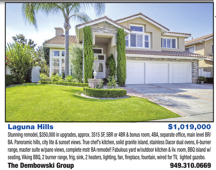 Laguna Hills $1,019,000 Stunning remodel, $350,000 in upgrades, approx. 3515 SF, 5BR or 4BR & bonus room, 4BA, separate office, main level BR/ BA. Panoramic hills, city lite & sunset views. True chef’s kitchen, solid granite island, stainless Dacor dual ovens, 6-burner range, master suite w/pano views, complete mstr BA remodel! Fabulous yard w/outdoor kitchen & liv. room, BBQ island w/ seating, Viking BBQ, 2 burner range, frig, sink, 2 heaters, lighting, fan, fireplace, fountain, wired for TV, lighted gazebo. The Dembowski Group 949.310.0669