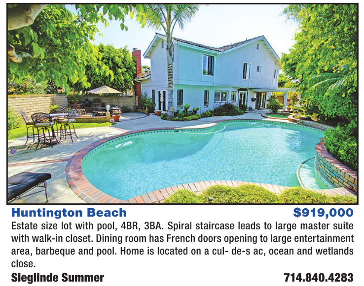 Huntington Beach $919,000 Estate size lot with pool, 4BR, 3BA. Spiral staircase leads to large master suite with walk-in closet. Dining room has French doors opening to large entertainment area, barbeque and pool. Home is located on a cul- de-s ac, ocean and wetlands close. Sieglinde Summer 714.840.4283