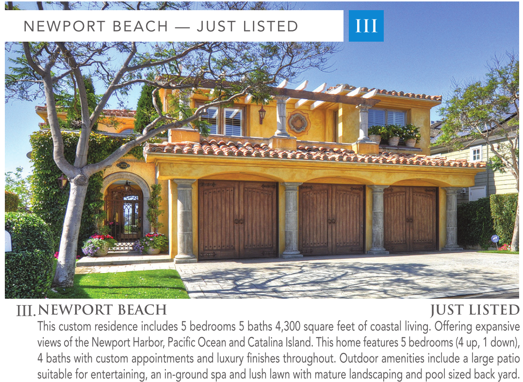 III. NEWPORT BEACH JUST LISTED This custom residence includes 5 bedrooms 5 baths 4,300 square feet of coastal living. Offering expansive views of the Newport Harbor, Pacific Ocean and Catalina Island. This home features 5 bedrooms (4 up, 1 down), 4 baths with custom appointments and luxury finishes throughout. Outdoor amenities include a large patio suitable for entertaining, an in-ground spa and lush lawn with mature landscaping and pool sized back yard.