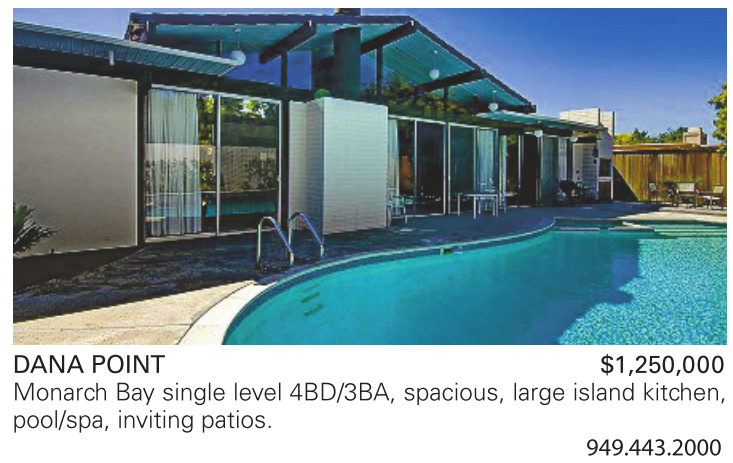 DANA POINT $1,250,000 Monarch Bay single level 4BD/3BA, spacious, large island kitchen, pool/spa, inviting patios.