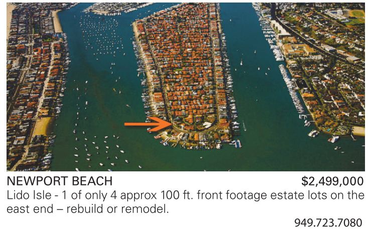 NEWPORT BEACH $2,499,000 Lido Isle - 1 of only 4 approx 100 ft. front footage estate lots on the east end – rebuild or remodel.