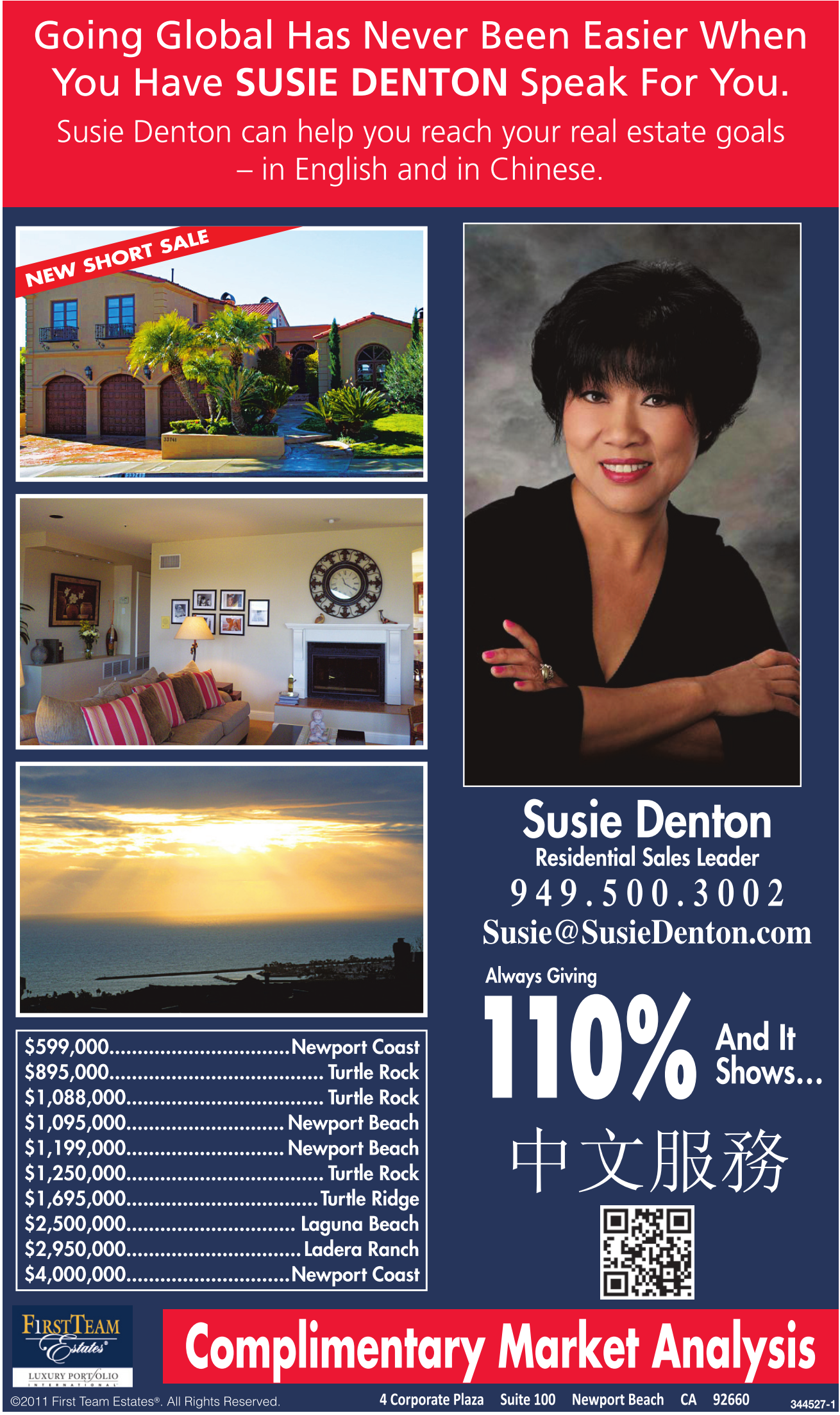 Going Global Has Never Been Easier When You Have SUSIE DENTON Speak For You. Susie Denton can help you reach your real estate goals – in English and in Chinese. Susie Denton Residential Sales Leader 9 4 9 . 5 0 0 . 3 0 0 2 Susie@SusieDenton.com $599,000................................Newport Coast $895,000...................................... Turtle Rock $1,088,000................................... Turtle Rock $1,095,000............................ Newport Beach $1,199,000............................ Newport Beach $1,250,000................................... Turtle Rock $1,695,000..................................Turtle Ridge $2,500,000.............................. Laguna Beach $2,950,000............................... Ladera Ranch $4,000,000.............................Newport Coast ©2011 First Team Estates ® . All Rights Reserved. Always Giving 110% Complimentary Market Analysis 4 Corporate Plaza Suite 100 Newport Beach CA 92660 And It Shows… 344527-1