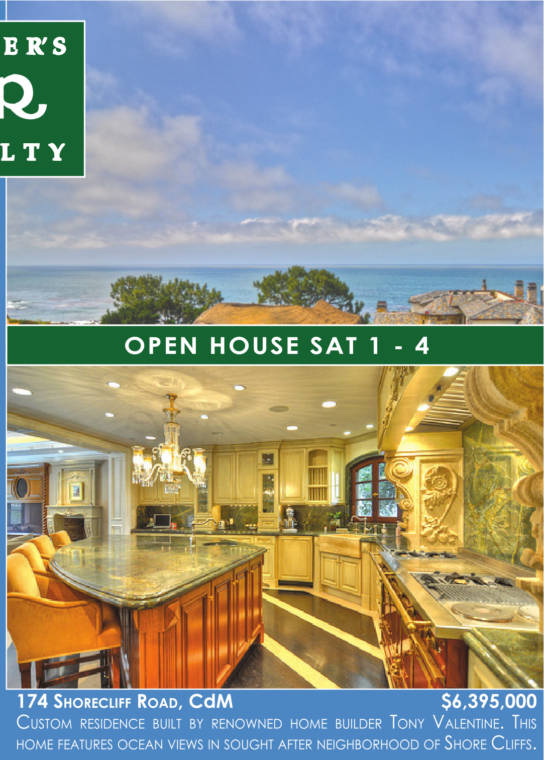 $4,995,000 PRIVATE STREETS IN CdM, FEATURING PANORAMIC THE FOREMOST IN REFINED LIVING. OPEN HOUSE SAT 1 - 4 174 SHORECLIFF ROAD, CdM $6,395,000 CUSTOM RESIDENCE BUILT BY RENOWNED HOME BUILDER TONY VALENTINE. THIS HOME FEATURES OCEAN VIEWS IN SOUGHT AFTER NEIGHBORHOOD OF SHORE CLIFFS.