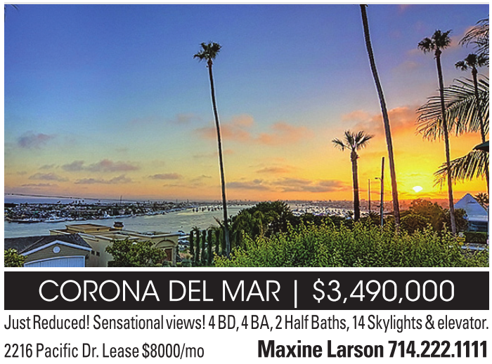Just Reduced! Sensational views! 4 BD, 4 BA, 2 Half Baths, 14 Skylights & elevator. 2216 Pacific Dr. Lease $8000/mo Maxine Larson 714.222.1111