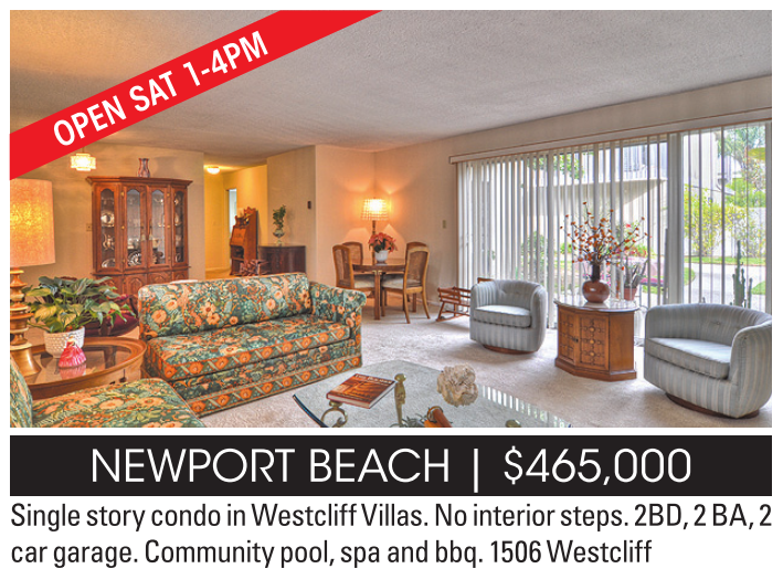 Single story condo in Westcliff Villas. No interior steps. 2BD, 2 BA, 2 car garage. Community pool, spa and bbq. 1506 Westcliff