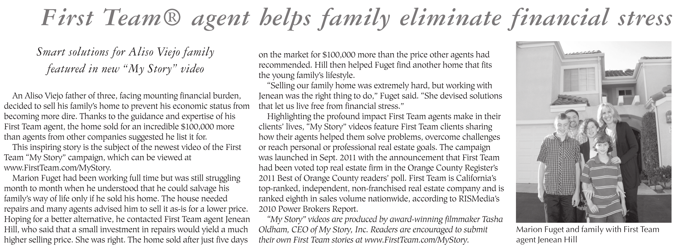 Highlighting the profound impact First Team agents make in their clients’ lives, “My Story” videos feature First Team clients sharing how their agents helped them solve problems, overcome challenges or reach personal or professional real estate goals. The campaign was launched in Sept. 2011 with the announcement that First Team had been voted top real estate firm in the Orange County Register’s 2011 Best of Orange County readers’ poll. First Team is California’s top-ranked, independent, non-franchised real estate company and is ranked eighth in sales volume nationwide, according to RISMedia’s 2010 Power Brokers Report.