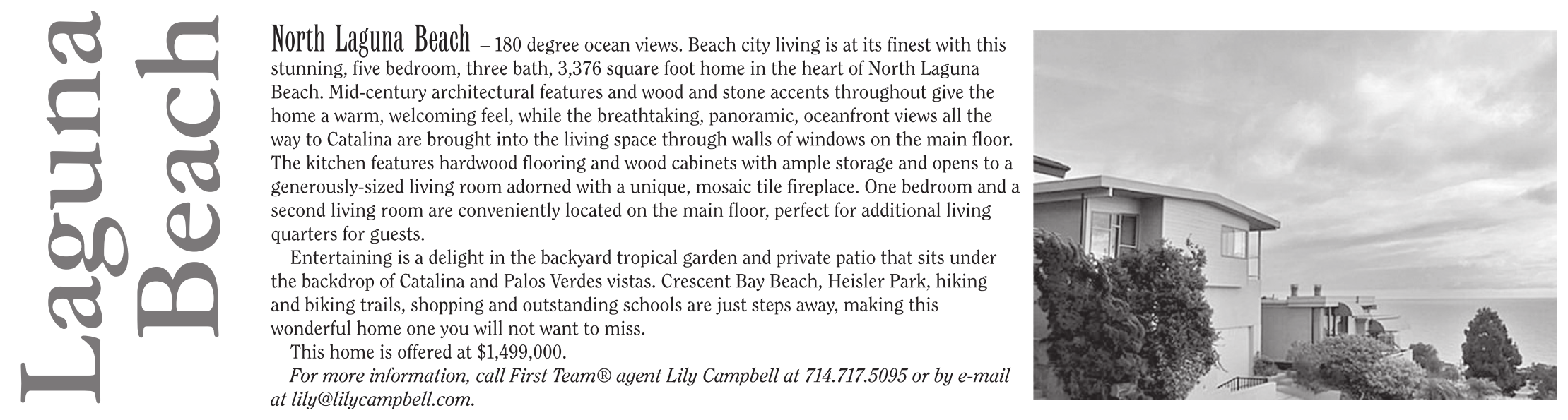 North Laguna Beach – 180 degree ocean views. Beach city living is at its finest with this stunning, five bedroom, three bath, 3,376 square foot home in the heart of North Laguna Beach. Mid-century architectural features and wood and stone accents throughout give the home a warm, welcoming feel, while the breathtaking, panoramic, oceanfront views all the way to Catalina are brought into the living space through walls of windows on the main floor. The kitchen features hardwood flooring and wood cabinets with ample storage and opens to a generously-sized living room adorned with a unique, mosaic tile fireplace. One bedroom and a second living room are conveniently located on the main floor, perfect for additional living quarters for guests. Entertaining is a delight in the backyard tropical garden and private patio that sits under the backdrop of Catalina and Palos Verdes vistas. Crescent Bay Beach, Heisler Park, hiking and biking trails, shopping and outstanding schools are just steps away, making this wonderful home one you will not want to miss. This home is offered at $1,499,000. For more information, call First Team® agent Lily Campbell at 714.717.5095 or by e-mail at lily@lilycampbell.com.