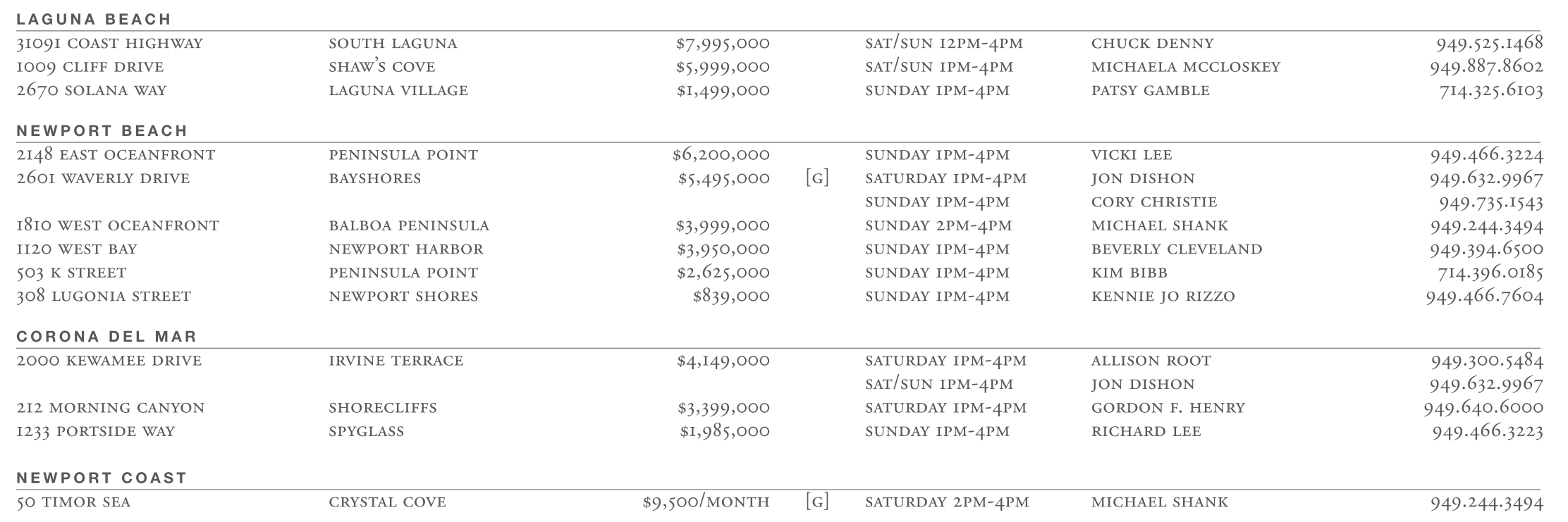 LAGUNA BEACH 31091 coast highway south laguna $7,995,000 sat/sun 12pm-4pm chuck denny 949.525.1468 1009 cliff drive shaw’s cove $5,999,000 sat/sun 1pm-4pm michaela mccloskey 949.887.8602 2670 solana way laguna village $1,499,000 sunday 1pm-4pm patsy gamble 714.325.6103