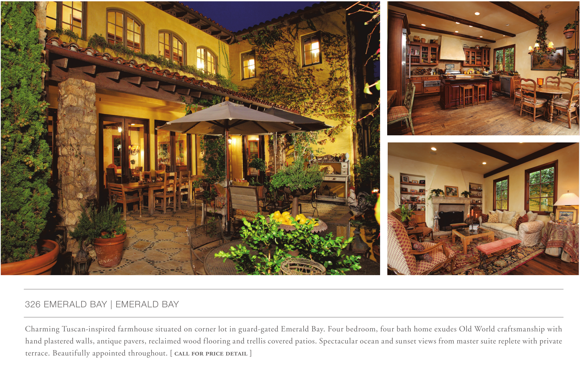 Charming Tuscan-inspired farmhouse situated on corner lot in guard-gated Emerald Bay. Four bedroom, four bath home exudes Old World craftsmanship with hand plastered walls, antique pavers, reclaimed wood flooring and trellis covered patios. Spectacular ocean and sunset views from master suite replete with private terrace. Beautifully appointed throughout. [ call for price detail ]