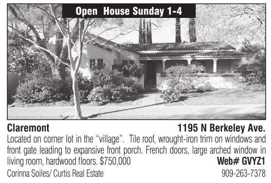 Claremont 1195 N Berkeley Ave. Located on corner lot in the “village”. Tile roof, wrought-iron trim on windows and front gate leading to expansive front porch. French doors, large arched window in living room, hardwood floors. $750,000 Web# GVYZ1