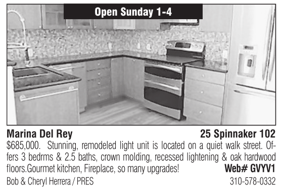 Marina Del Rey 25 Spinnaker 102 $685,000. Stunning, remodeled light unit is located on a quiet walk street. Offers 3 bedrms & 2.5 baths, crown molding, recessed lightening & oak hardwood floors.Gourmet kitchen, Fireplace, so many upgrades! Web# GVYV1